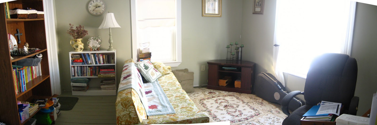 Arguments with your spouse can be really good for your house. (The bad part about marital spats is when you have to apologize to your spouse for your bad attitude and selfishness. :P) The other night, while I was a pouting brat upset, I put the kids to bed and tackled my "green room." Den? Sitting room? Whatever you call it, it needed some love. Well, my whole house needs love, but I want to put the Christmas tree in there, and I needed to clear a space for it. So while hubby was playing guitar at a neighbors house, I was emptied the room of the smaller furniture, rugs included, dusted, rearranged, and scrubbed the floor on hands and knees with a scrub brush. It has an old wide-planked wood floor that we painted, but it's pointless to wash it with a mop, as evident my the disgusting dirt paths left where rugs didn't cover. Couldn't hardly clean a room and just sorta wash the floor. I was in the midst of this when the Kong walked in at 2AM. He was shocked to 1. find me still awake, and 2. to find me cleaning. I still have a few things that need new homes, to clean off the desktop, and a load for recycling and thrift store, but it looks much improved, a place you'd want to be. The furniture arrangement, and some de-cluttering, helped a lot.